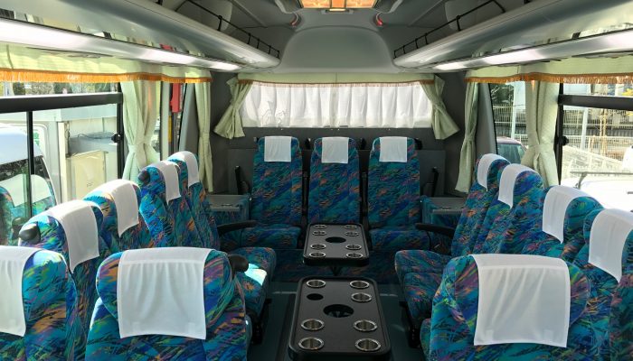 貫通式大型トランクを装備していながらもリーズナブルな高速料金車両区分に加え、大型バス並の広いシートを使用することで、ゆったりさもアップした希少な小型観光バスです。大型や中型バスより通路が若干狭いので、体格の大きな方は中型バスがオススメです。