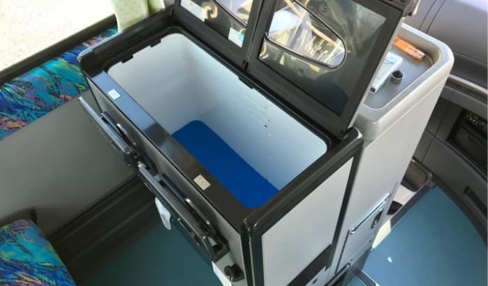 後列部サロン装備の大型観光バスで、最前席と最後部座席に冷蔵庫があり、ワイヤレスマイク2本あります。